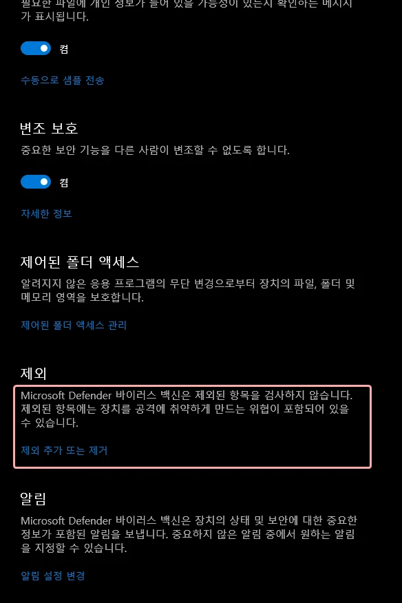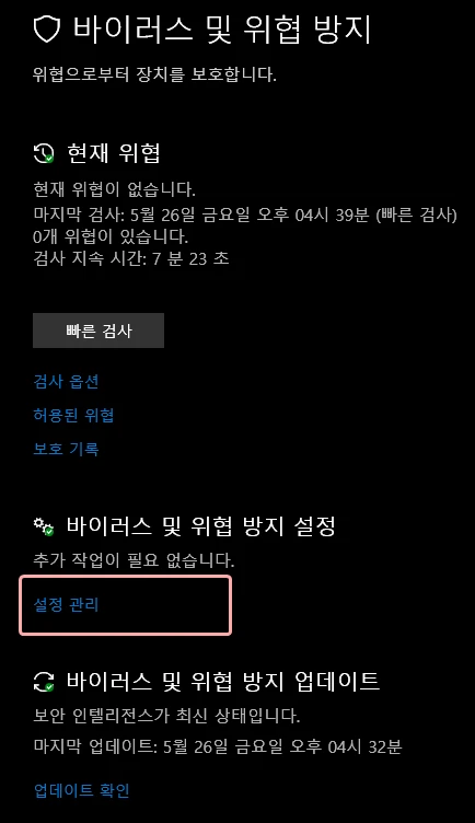 '바이러스 및 위협 방지 설정 -> 설정 관리'에 들어가 주세요.