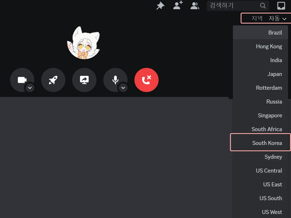 그룹 또는 DM 통화에서는 오른쪽 상단에 있는 지역을 'South Korea'로 변경하세요.