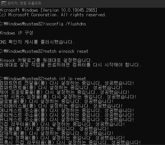 아래 명령어를 실행하고 컴퓨터를 다시 시작해 주세요!