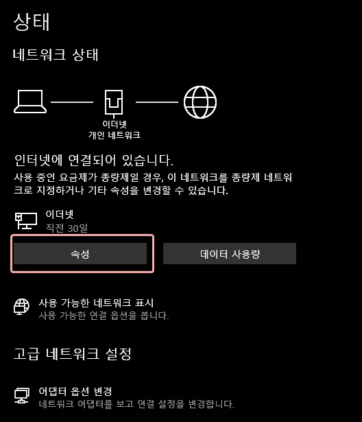 DNS 주소를 변경하려면 '네트워크 상태'를 검색해 주세요.
